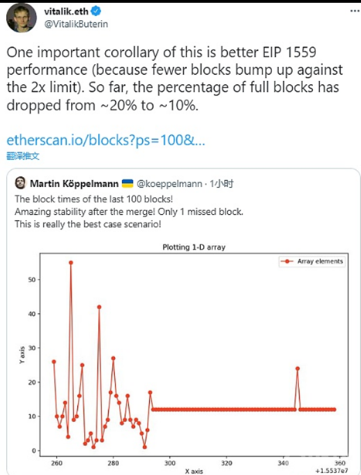 9月15日消息,以太坊预测平台Gnosis创始人Martin Köppelmann在推特发布最新100个区块的出块时间图表,并表示以太坊合并后稳定性极好,只有一个漏块,已经是最好的情况了。 对此,V神评论称,一个重要的推论是其实现更好的EIP 1559性能(因为更少的块会达到2x限制)。到目前为止,满块的百分比已经从大约20%下降到大约10%。