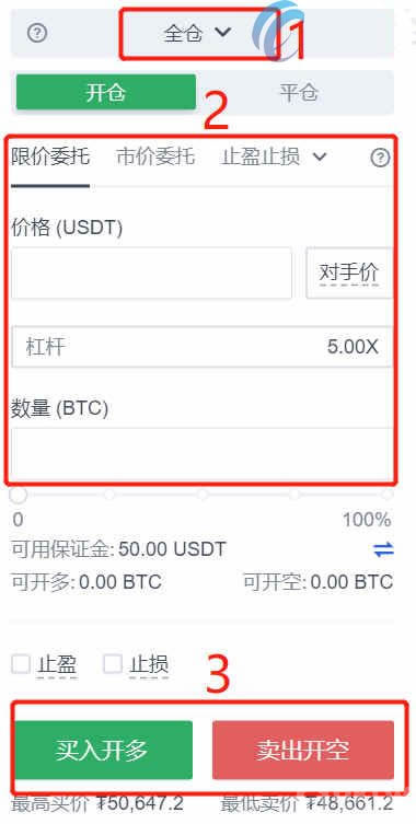 4. 在开仓选项下,选择全仓或逐仓。填写委托信息,进行【买入开多】或者【卖出开空】的交易操作。