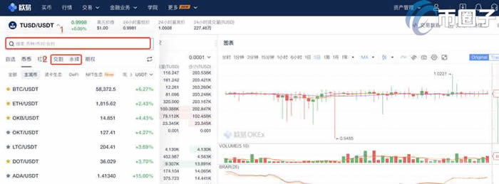 3. 点击币对栏,在下拉页面币种搜索栏里,输入您想要交易的币种、币对,再选择合约类型。