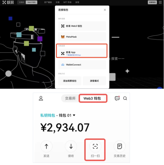 此外,如果您已经在APP端创建了Web3钱包,点击【扫码连接】中的【欧易app】,在欧易APP中,点击Web3钱包左上角的扫码,扫描谷歌浏览器弹出的【欧易APP二维码】,确认连接,即可进入网页端Web3钱包首页。