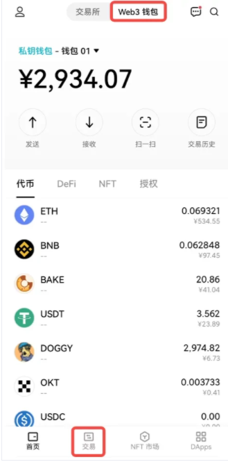 (1)进入【Web3钱包】-【交易】页面。