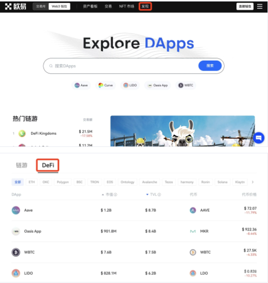 进入欧易官网,在页面左上角选择【Web3钱包】,点击【发现】,下拉界面即可看到可参与的项目列表。您可以选择【DeFi】,并选择【OKC】公链,发现优质项目。您也可以在顶部搜索框直接输入项目名称或网址,参与项目。