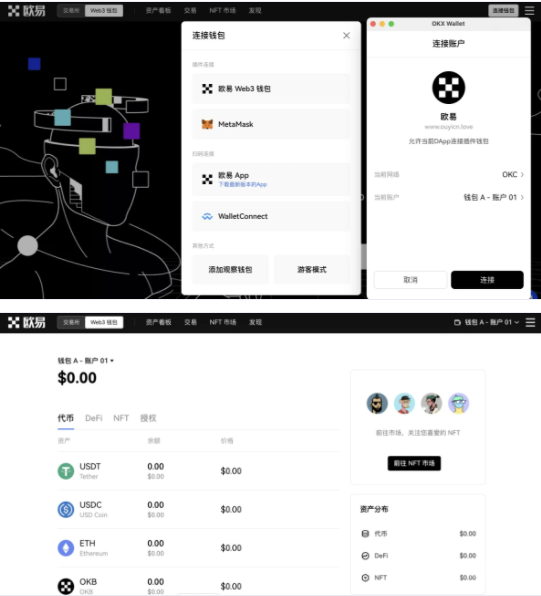 使用欧易Web3钱包前您首先需要先创建或连接Web3钱包。Web3钱包是基于浏览器的数字资产管理工具,用户可以通过钱包直接授权,进而参与市场上的DeFi、NFT项目。欧易Web3钱包支持查看资产、转账收款、连接与授权DApp、添加或切换网络等功能。
