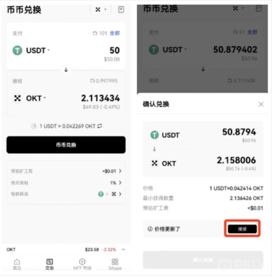(4)询价结束并完成授权后,您可点击「币币兑换」按钮发起交易,之后在二次弹窗中确认交易信息,点击「确认兑换」按钮并在钱包中确认以完成交易。此外,若此过程中交易价格发生变化,您须在二次弹窗中点击「接受」按钮接受新的报价后,点击「确认兑换」并在钱包中确认以完成交易。