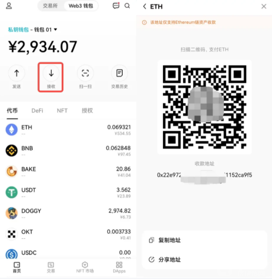 点击【接收】,选择转入币种,会弹出收款地址,复制地址粘贴到其他平台或者钱包的提币界面,便可以将数字资产成功充入Web3钱包。