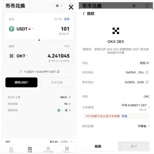 另外,对于未授权或授权额度不足的币种,您须首先点击「授权 」按钮发起授权申请,在钱包中确认并完成授权后,才可进行下一步交易。