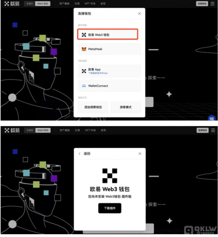 使用谷歌浏览器登录欧易官网,点击顶部切换【Web3钱包】,点击【连接钱包】-选择【欧易 Web3钱包】,点击【下载插件】。