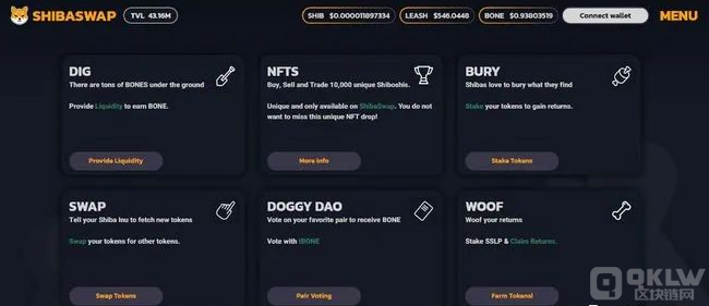 首先是 ShibaSwap,一个面向 SHIB 持有者的原生去中心化金融 (DeFi) 生态系统。就像其他主要的 DeFi 一样,ShibaSwap 拥有一个收益农业模块、加密货币交易所和流动资金池。在 ShibaSwap 上,加密货币持有者可以立即将以太坊 (ETH) 兑换成 Shiba Inu (SHIB) 及其相关的代币 BONE 和 LEASH。