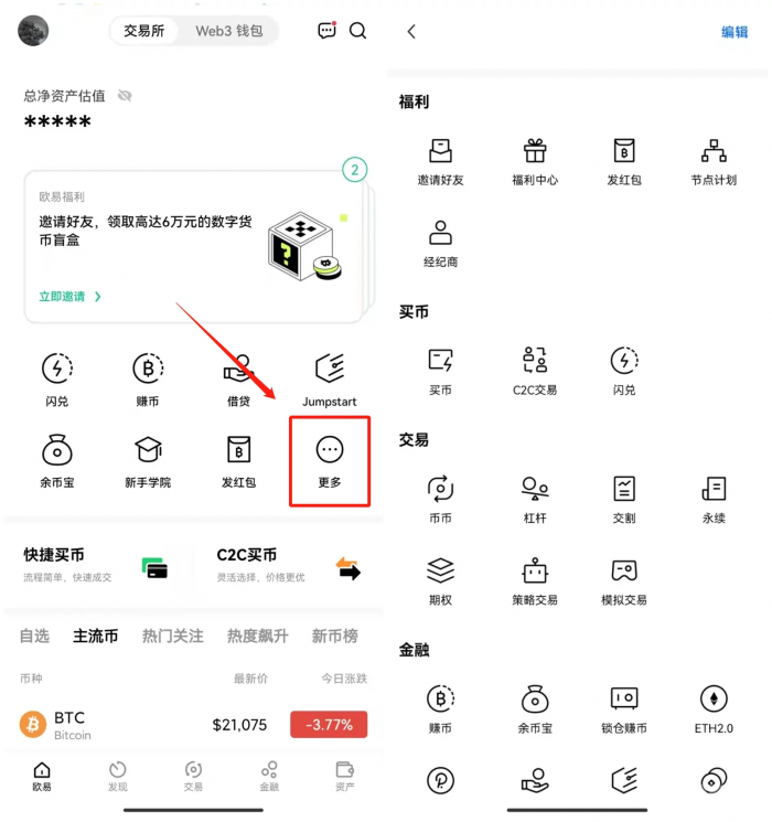 登录欧易app,在首页点击【更多】,即可看到欧易各个功能的入口,下面我们将逐一介绍。