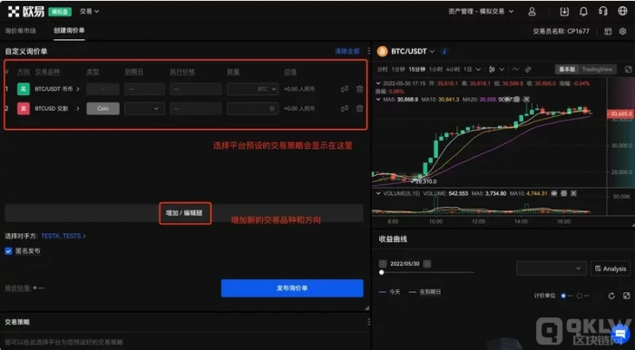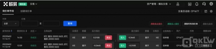 欧易大宗组合交易平台面向高净值个人和专业机构,支持加密资产现货、衍生品的交易及任意组合的多腿结构(即不同交易品种、双向的订单共存,详见下文举例)。平台主要分为两大模块:创建询价单和询价单市场。