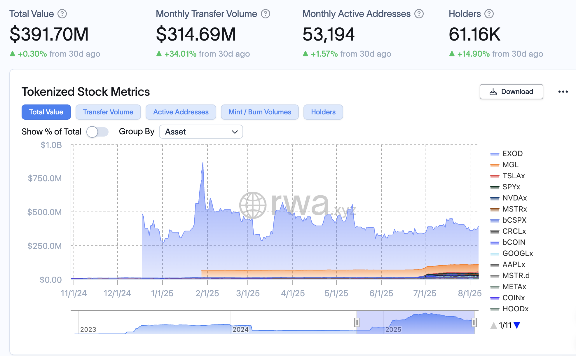 这一趋势背后是监管环境的迅速明朗与传统巨头的入场。纳斯达克交易所已提议创建数字资产版的 ATS(另类交易系统),允许代币化证券与商品类代币共同上市交易,以提高市场流动性和效率。SEC 委员保罗·阿特金斯(Paul Atkins)更是将传统证券上链类比为音乐载体的数字化革新:正如数字音乐颠覆了音乐产业,证券的链上化有望实现全新的发行、托管与交易模式,重塑资本市场的方方面面。但该领域仍处于早期阶段,相比于动辄几十亿美元的其他 RWA 领域,美股代币化赛道的上涨空间似乎更大,当前链上股票的总体市值还不足 4 亿美元,而每月的交易量也仅仅 3 亿美元左右。