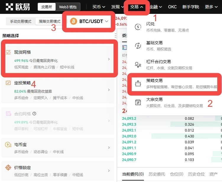 欧易【交易】-【策略交易】,选择现货交易对后选择【现货网格】,即可体验使用该策略工具,可使用官方提供的策略智能创建模式,也可以选择手动创建。