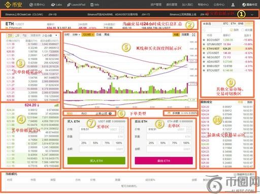 ①区域为币安消息展示区;②区域为当前交易对24小时成交信息汇总;③区域为卖单价格显示区;④区域为买单价格显示区;⑤区域为K线和买卖深度图展示区;⑥区域为下单类型;⑦区域为买单区;⑧区域为卖单区;⑨区域为其他交易市场、交易对切换区;⑩区域为最新成交价格显示区。